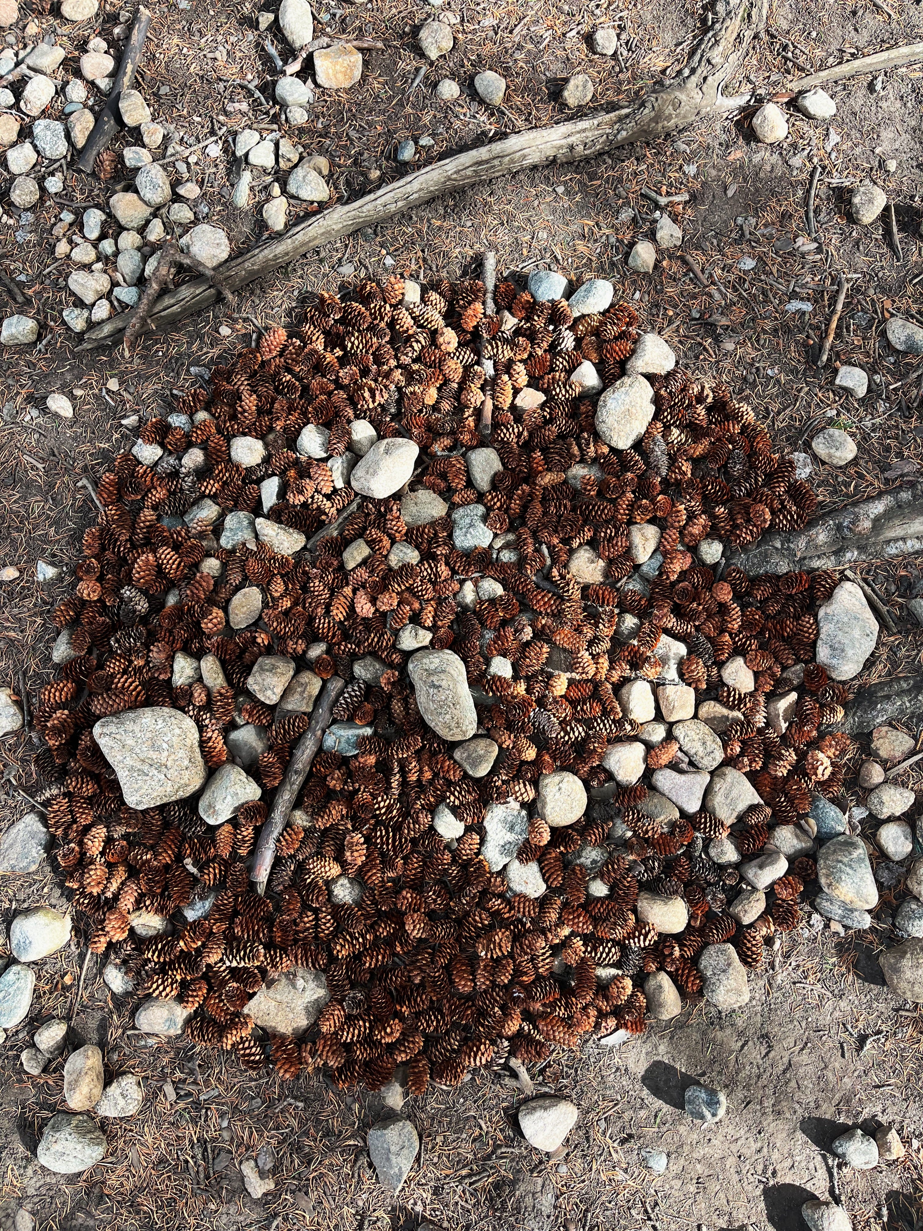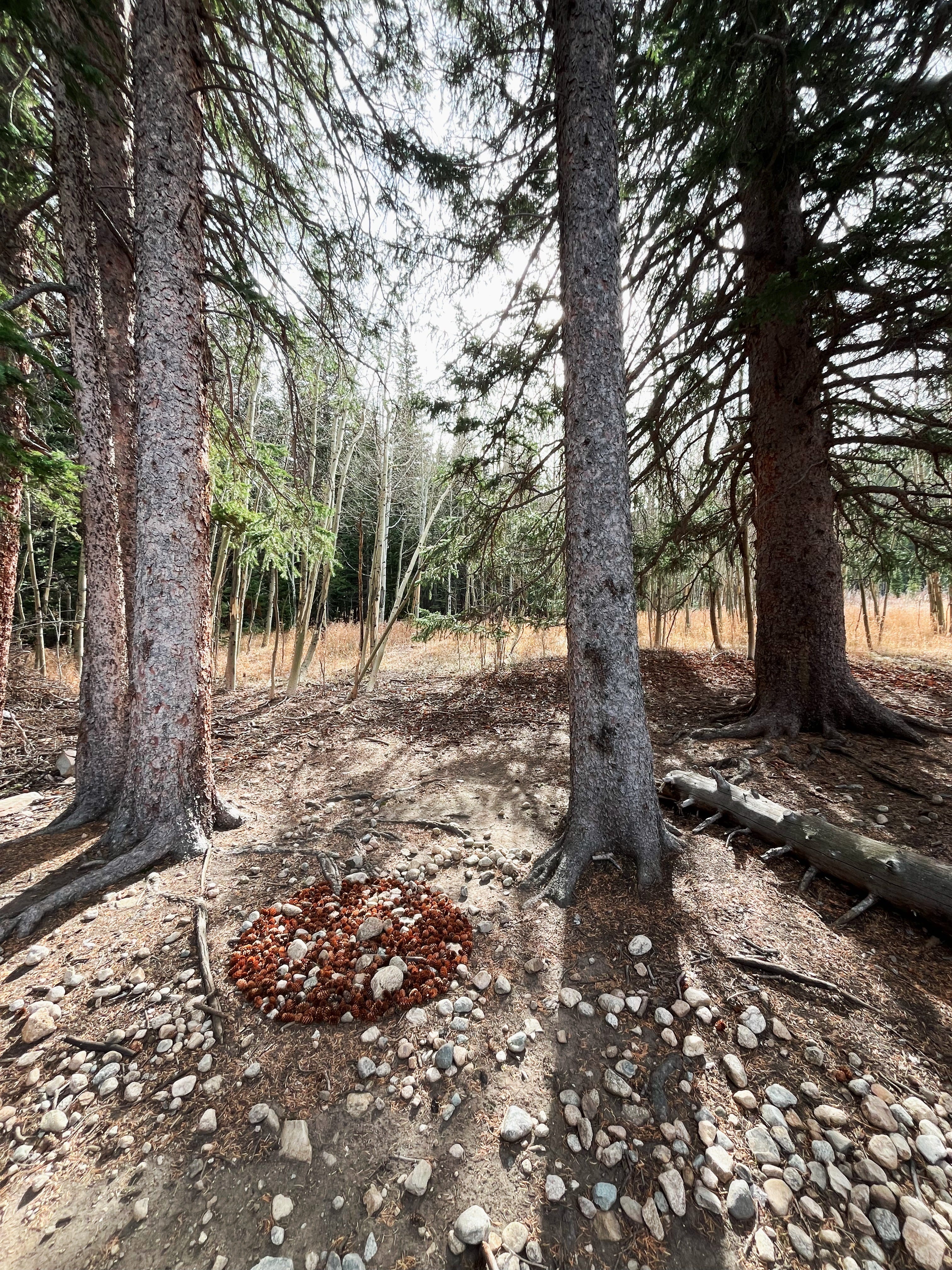 Instead of clearing the area, I kept the rocks and sticks that lay on the ground. I constructed the cones in a circular fashion, representing the trunk of the next tree. I placed only a few, allowing most of them to fall where they may. In one layer, they gathered vertical, horizontal, and perpendicular to the last. An irregular pattern took shape. A tapestry was formed, revealing the intricacies of each cone and the communication between them.
